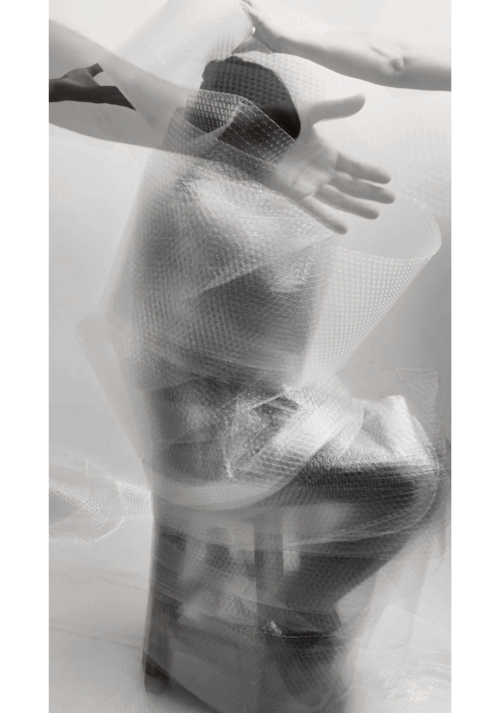 layers of bubble wrap. This act begins with the artist’s own hands—